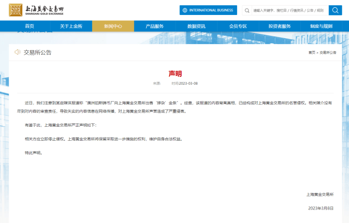 相关方应立即停止侵权。上海黄金交易所将保留采取进一步措施的权利,维护自身合法权益。