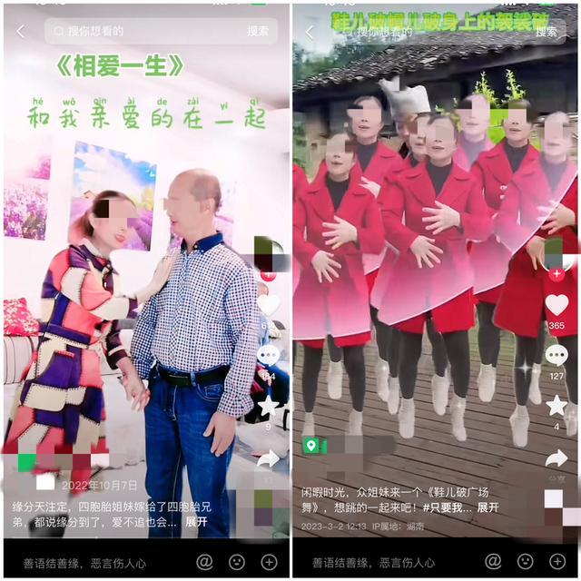 在“4对面容相像的夫妻唱着歌,依次出场”的短视频中,人物都进行了抠图处理。只要稍微仔细一点,就会发现人物与场景是合成的。同时,“4对夫妻”看似依次出场,细看却有画面嫁接的痕迹。