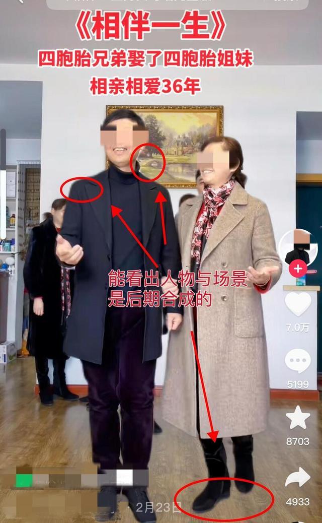 另一方面,短视频本身漏洞百出,直接暴露了“四胞胎兄弟迎娶四胞胎姐妹”的真相:发布者编造。