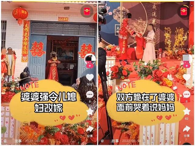 更有短视频发布者直接将相关视频纳入“人间故事”,“看图说话”甚至“看图说胡话”,加入各种煽动网友情绪的介绍。例如,在“儿媳改嫁”中,有短视频发布者解读:“(新婚夫妻)双方跪在了婆婆面前,哭着说妈妈……”但视频画面与发布者讲述完全不一致。