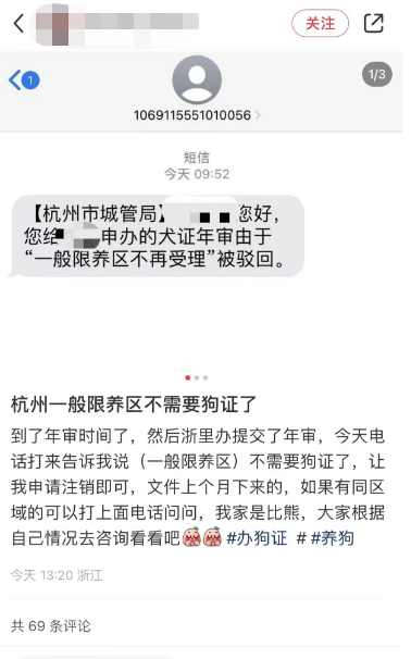 事情的起因,是一位网友在社交平台小红书发了一条帖子。大意就是,杭州一般限养区好像不需要狗证了。 网友说,狗狗的犬证即将到年审时间,就去浙里办提交了年审,结果今天接到电话,说“不需要狗证了”,让我申请注销。我家是比熊,大家根据自己情况去咨询看看吧!