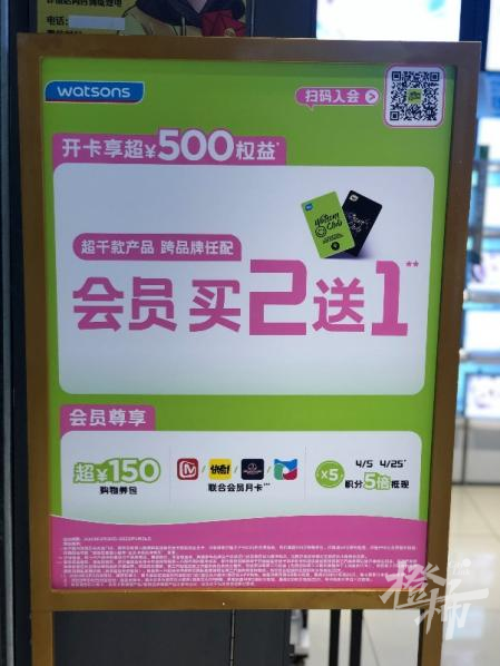 店门口还立着一块会员专享的开卡礼包立牌,上面写着会员买2送1,部分产品还有2件以上8折等优惠。