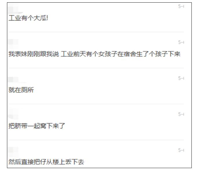 广西一高校女生宿舍产子后,将婴儿从二楼扔下?校方:我校没有发生过此类事情 2023-05-10 13:51 近日,一段关于弃婴的聊天记录和视频在网络流传,内容称广西工业职业技术学院一女学生在学校产子后,将婴儿从二楼扔下,孩子脐带都还没被剪断。