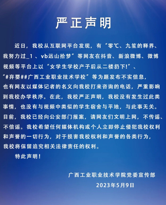 5月9日晚,学校在官方公众号发布声明称,网友发布的信息不实,学校没有发生过此类事件,也没有与视频中类似的学校宿舍与平地,与此事无关。目前,学校已经向公安部门报案。 以下为声明全文: 近日,我校从互联网平台发现,有“零·C、九的释界、我努力过 1、vb远山拾梦”等网友在抖音、新浪微博、微博视频等平台上以“女学生学校产子后从二楼扔下!” “#弃婴##广西工业职业技术学校等为题发布不实信息,也有网友以媒体记者的名义向我校打来咨询的电话。严重影响到我校办学秩序。在此,我校严正声明,我校没有发生过此类事情,也没有与视频中类似的学校宿舍与平地,与此事无关。目前我校已经向公安部门报案,请网友们文明上网,不传谣、不信谣。我们将保留追究造谣、传谣人的法律责任。
