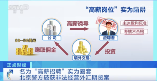 在考核阶段,公司会以高薪为诱饵,诱导应聘者每天都在指定的境外期货交易平台上投资。而公司在每笔交易中,都可以赚取境外平台30至50美元的佣金,直至应聘者的本金在交易中损失耗尽,公司再以“未达到盈利标准、考核不合格”为由,拒绝招录应聘者。目前,北京警方打掉相关犯罪团伙6个,刑事拘留犯罪嫌疑人51人,涉案金额近4亿元。 北京市公安局经侦总队金融证券犯罪侦查支队政委 周岩:外汇期货这类经营,是需要国家相关审批机关审批的,在没有资质的情况下从事经营,组织投资者进行外汇期货的交易,属于违法行为,可能会涉嫌非法经营。