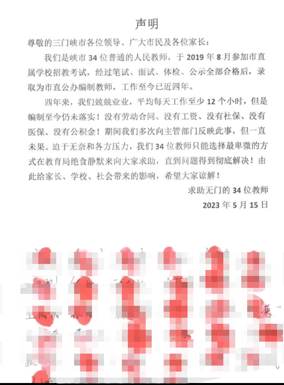 5月15日,三门峡市民办学校34名教师到教育局反映其编制问题,网络还流传出一份34人签字的声明,称2019年考取了市直公办教师编制,但工作四年确没有签订劳动合同,甚至没有工资,单位也未缴纳社保及公积金。
