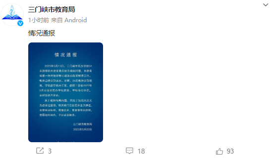 此事引发广泛关注,5月22日,三门峡市教育局发布通报: 2023年5月15日,三门峡市民办学校34名教师到市教育局反映其编制问题,市教育局第一时间做好耐心细致的政策解读工作,教师当晚全部返回。目前,34名教师全部在岗,学校教学秩序正常。教师工资在2022年9月以前由民办学校发放,学校转公办后由财政逐月发放。关于教师编制问题,因处于规范民办义务教育过渡期,相关部门已按程序全力推进本着依法依规、尊重历史、尊重事实的原则在最短时间内,予以妥善解决。