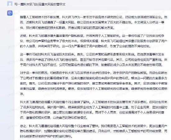据了解,网络上有人利用国内一款生成式AI写做了一篇“科大讯飞出现重大风险的警示文”,该消息流出后引发广泛关注。“警示文”称,科大讯飞涉嫌大量采集用户隐私数据,并将其用于人工智能研究。 科大讯飞表示,这一事件引起了广泛的关注和争议,给公司的声誉和业务带来了极大的冲击。该事件系某生成式AI撰写的科大讯飞风险警示,公司并未发生相关事件,公司法务部已对相关信息取证。 此外,5月23日有媒体援引知情人士的话称,美国正在考虑是否将科大讯飞、美亚柏科等加入“实体名单”,禁止它们使用美国的组件或软件。 潮新闻记者了解到,科大讯飞已经于2019年10月被列入实体清单,对该公司日常经营未产生重大影响。 来源:潮新闻 作者: 编辑:李佳萌 |