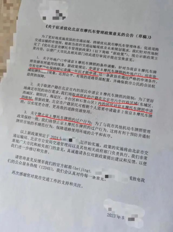 网传北京将出台摩托车管理新措施 这份网传文件的标题为《关于征求优化北京市摩托车管理政策意见的公告(草稿)》,其中列举了三项主要的调整内容以及新政策实施时间,其所表述内容涵盖:将放开北京户籍居民登记京B摩托车牌照的区域限制;一人可申请两张摩托牌照;禁止京A牌照过户等。同时,网传文件还附带了一个可以进行意见反馈的官方邮箱,不过却打上了厚厚的马赛克,但文件还提及,市民意见可以通过12345热线进行反映。 多方回应:假消息 对此,北京12345热线相关工作人员表示,目前并没有收到相关公告,也无法确定这份网传文件的真实性。随后,新京报记者向北京市交通委以及北京市公安局公安交通管理局进行求证,上述两个部门的工作人员均表示,这份文件肯定不是政府发布的,目前并没有这样的政策调整。这份网传文件与政府部门的行文规范和行文习惯完全不一致,甚至在其中还出现了“北京市交通运输局”这一本不存在的部门名称。据悉,2018年,根据《北京市机构改革实施方案》,北京市交通委员会不再保留内设的运输管理局。 摩托车管理政策“谣言”屡次出现 值得一提的是,关于北京摩托车管理政策的“谣言”并不是第一次出现。2019年11月,就曾有传言称“京B摩托车将暂停上牌”,后经北京市交管局官方证伪,表示当时并无任何针对摩托车管理的新政被提出,各项执法工作也均是在现有法律法规的框架内实施,北京市对京B号牌摩托车的法律法规以及管理方式并无变化。 来源:北京交通广播 作者: 编辑:李佳萌 |