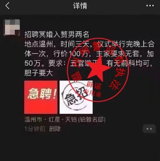 捉谣记 | 温州有人招聘冥婚入赘?假的 2023-06-05 18:35 近期,一则关于温州招聘冥婚入赘的朋友圈截图在本地网上流传,由于其内容公开宣扬封建迷信糟粕且过于恐怖猎奇,引发网络关注的同时,不少网友也质疑此为不实信息。