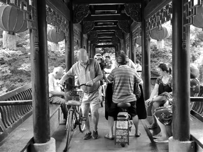 日头升起,气温虽然高,但太平桥桥面上凉风阵阵,不少老人坐在廊桥座椅上乘凉聊天。