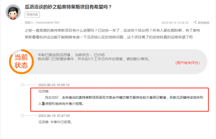 昨天,瓜沥镇明确给出回复:奥特莱斯项目因双方就合作模式等方面存在较大差异已暂缓,目前瓜沥镇将该地块列入重点招引地块向外推介招商。