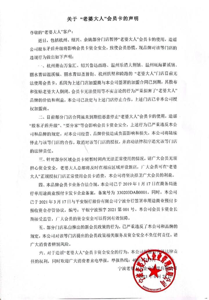 老婆大人发声明,萧山万象汇、拱墅和睦路等门店系合同到期已停止合作,对恶意造谣行为将追究法律责任 2023-06-28 15:40 6月27日下午,“老婆大人量贩零食”在其官方公众号上发布了关于会员卡的声明。