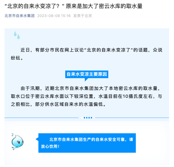 8月8日,北京市自来水集团发文解释自来水变凉的主要原因——