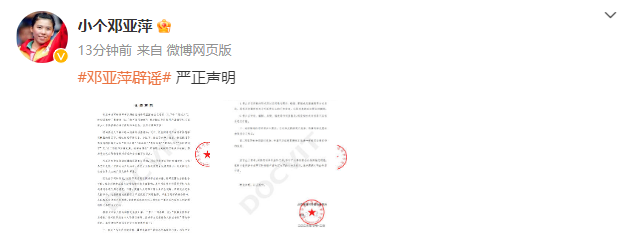 邓亚萍12日发布律师声明:有关“邓亚萍涉嫌贪腐、被带走调查”等消息纯属造谣污蔑,邓亚萍女士予以强烈谴责。