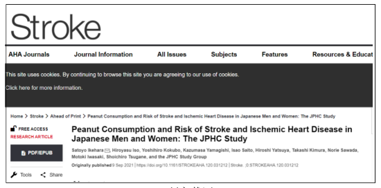 ① Satoyo Ikehara, et al.,(2021). Peanut Consumption and Risk of Stroke and Ischemic Heart Disease in Japanese Men and Women:The JPHC Study. Stroke, DOI: 10.1161/STROKEAHA.120.031212.