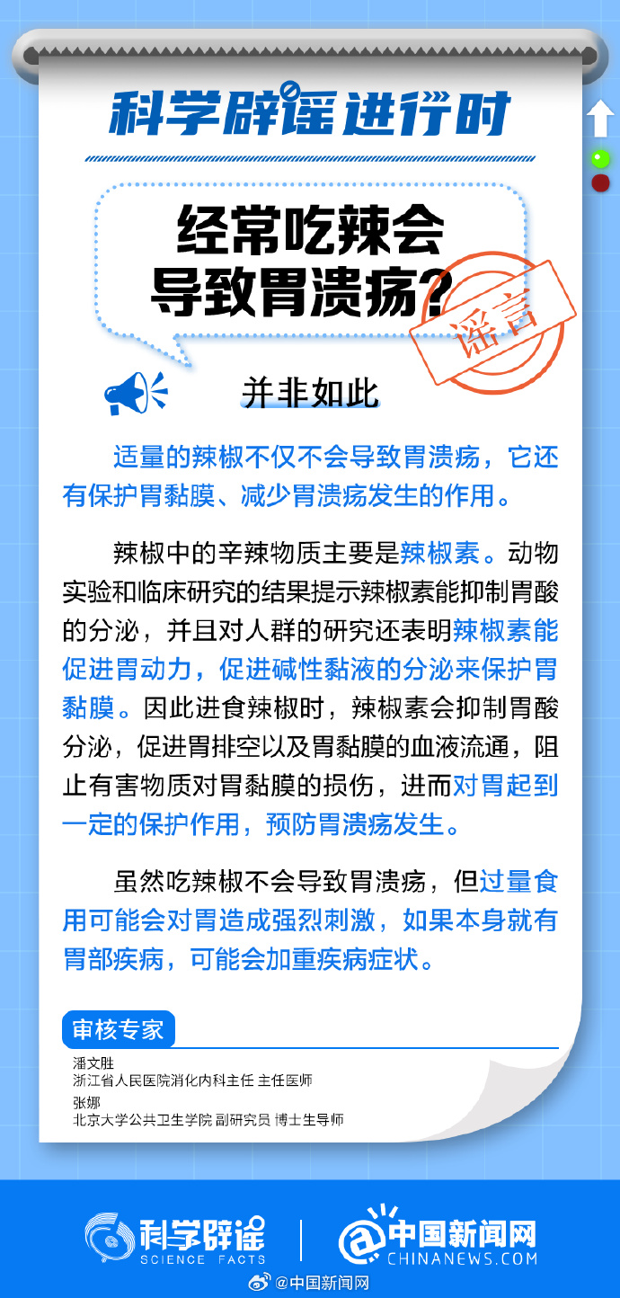 中新网8月23日电 适量的辣椒不仅不会导致胃溃疡,它还有保护胃黏膜、减少胃溃疡发生的作用。辣椒中的辣椒素会抑制胃酸分泌,促进胃排空以及胃黏膜的血液流通,阻止有害物质对胃黏膜的损伤,进而对胃起到一定的保护作用,预防胃溃疡发生。但过量食用辣椒可能会对胃造成强烈刺激,如果本身就有胃部疾病,可能会加重疾病症状。(来源:@科学辟谣 @中国新闻网 )