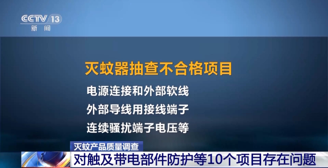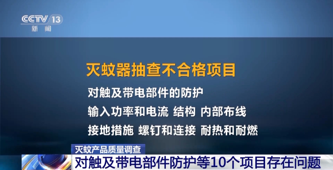 据了解,江苏省这次抽查的40批次灭蚊器,由苏州市产品质量监督检验院和江苏省产品质量监督检验研究院,联合买样和检测。检测发现,16批次不合格样品,主要是对触及带电部件的防护、接地措施、耐热耐燃等10个项目存在问题,不符合国家标准要求。