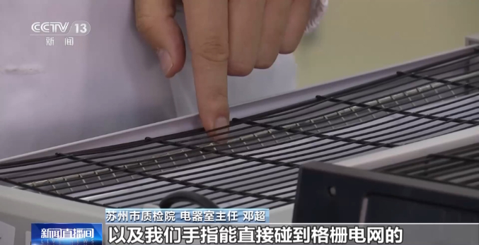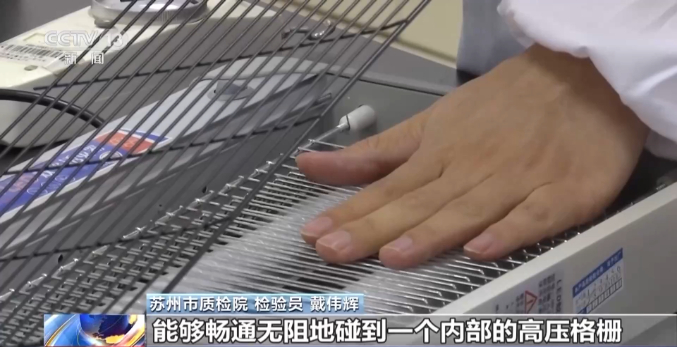 苏州市质检院 检验员 戴伟辉:这些都是对触及带电部件的防护项目不合格,像这种电击式的灭蚊器,它是通过内部高压格栅,产生一个高达几千伏的高压电,来电死蚊子。我们拿我们的模拟人试验手指,可以看到从下面的空隙中,可以很轻易地碰到这个高压格栅,你看,包括这上面的和下面的格栅都会轻易碰得到,人会有触电的风险,这个防护罩没有做到一个可靠固定,防护罩可以很轻易地取下,特别是小孩子的手指,能够畅行无阻地碰到一个内部的高压格栅,会有一个触电的风险。