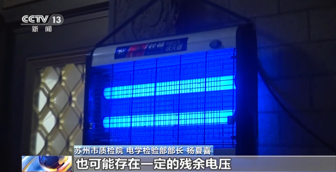 苏州市质检院 电学检验部部长 杨夏喜:这样一款电击式的灭蚊器,它里面有一个高压电网,当这个电网电死了蚊子以后,蚊子附着在这个高压电网上,可能会把这个高压电网给短路掉,形成短时的大电流,这样的一个大的电流,会让这个蚊子,可能是起火,起火以后的蚊子掉在了灭蚊器下面的塑料托盘上,如果这个塑料件是不阻燃的话,它可能会着火,同时引燃灭蚊器周围的一些可燃物,这样的话就会产生比较大的火灾事故。