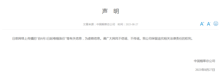 日前网络上传播的“自9月1日起卷烟涨价”等有关信息,为虚假信息。请广大网民不信谣、不传谣。我公司保留追究相关法律责任的权利。