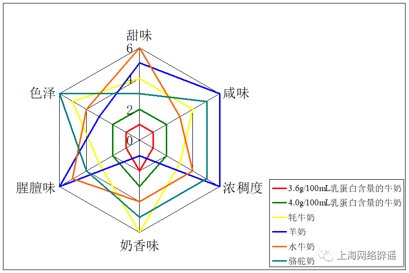 感官评价小组从甜味、咸味、浓稠度、奶香味、腥膻味和色泽六方面对部分样品进行了感官评价。结果显示,相较于牛奶:牦牛奶的奶香更为浓郁、颜色较深、味道也更强烈些;羊奶浓稠且腥膻味更重、喝上去更加咸;水牛奶有更强烈的甜味,但腥膻味也比牛奶强一些;骆驼奶的颜色最深、奶香味浓郁。