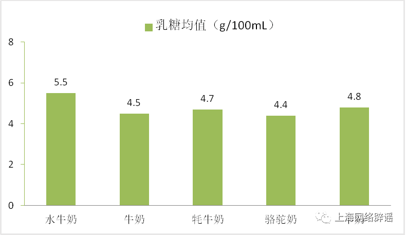 脂肪和糖也是大家比较关注的成分,具体来看,羊奶的脂肪含量最低,均值为3.4g/100mL,牛奶的脂肪含量最高,均值为4.6g/100mL ;5类样品的主要糖源均为乳糖(在总碳水化合物中占比均在99%以上),其中水牛奶的乳糖含量较高,均值为5.5g/100mL,骆驼奶的乳糖含量较低,均值为4.4g/100mL。全部样品的果糖、葡萄糖、蔗糖、麦芽糖均未检出 。