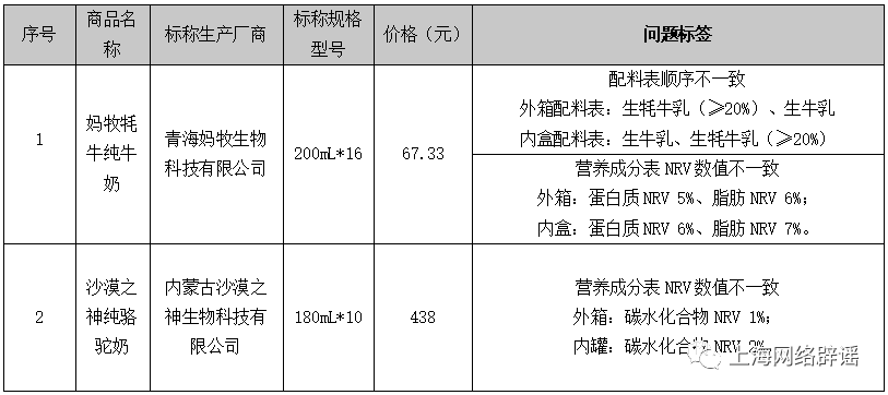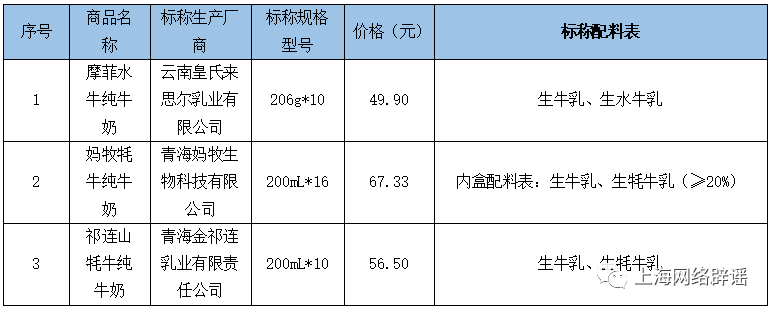 此外,部分样品从配料表看是混合乳源(如配料表:生牛乳、生水牛乳或生牛乳、生牦牛乳)且从配料表顺序可说明其原料一半以上为生牛乳,但其商品名称却为“水牛纯牛奶”或“牦牛纯牛奶”,其商品名称非常容易与单一乳源的纯奶相混淆。