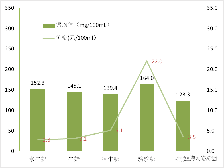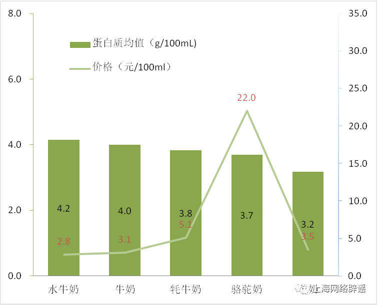 上海市消保委委托上海市食品研究所有限公司,对样品的蛋白质、钙、脂肪、糖、碳水化合物等营养物质进行了检测,并对不同乳源样品进行分类比较。本次比较试验共计购买了32款小众奶,包括6款水牛奶、7款牦牛奶、6款骆驼奶、6款羊奶和7款牛奶(牛奶多为中高端产品),价格从1.5元至25.4元/100mL不等。