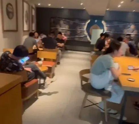 8日中午12点至下午1点,“澎湃明查”核查员于星巴克(览海国际广场店)店内拍摄的视频截图,店内已几乎满座。