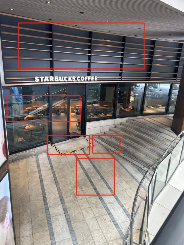 网传图片中比较具有辨识度的店面设计、门口台阶、地砖、窗口反射的电梯画面等,都能与星巴克(览海国际广场店)的环境图一一对应。