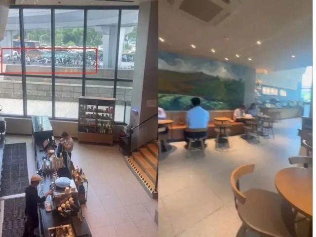 上:网传图片。下:9月8日上午览海国际广场的星巴克分店实况图。