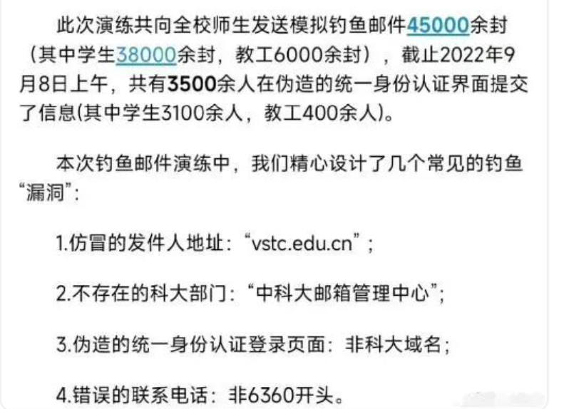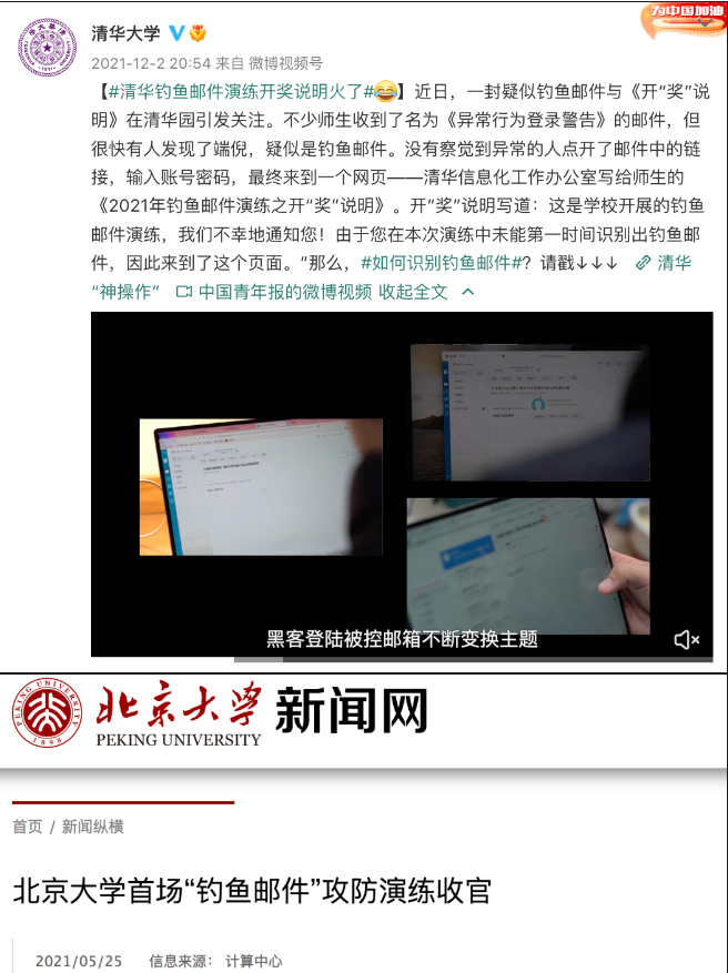 2021年,清华大学和北京大学陆续进行了“钓鱼”邮件演练。北京大学称: 演练当天,共有4万余名师生收到这封模拟“钓鱼”邮件,54%的师生阅读了邮件,其中约5000名师生点击了可疑链接,约2000名师生在后续登录页面输入了用户名和密码。