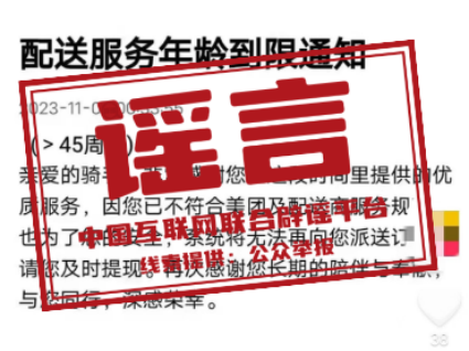 真相:近日,一张“配送服务年龄到限通知”的截图在网络流传,称“年龄超过45岁后,就不再符合某外卖平台及配送服务商的服务规范,系统将不再派送订单”。经向该外卖平台核实,此信息为谣言。该平台工作人员在接受记者采访时称,考虑到配送过程中相关安全因素,会对骑手的年龄限制在18周岁至57周岁之间,在此年龄范围内,且具有完全民事行为能力和相应的独立劳动能力,身体健康、持有有效健康证且无相关类型疾病,符合无违法犯罪记录、熟练驾驶相关车辆等要求的人员均可注册为网约配送员,网传“配送员年龄上限为45岁”系虚假信息。(来源:北京网络辟谣、上海网络辟谣、湖北网络辟谣)