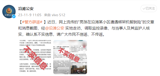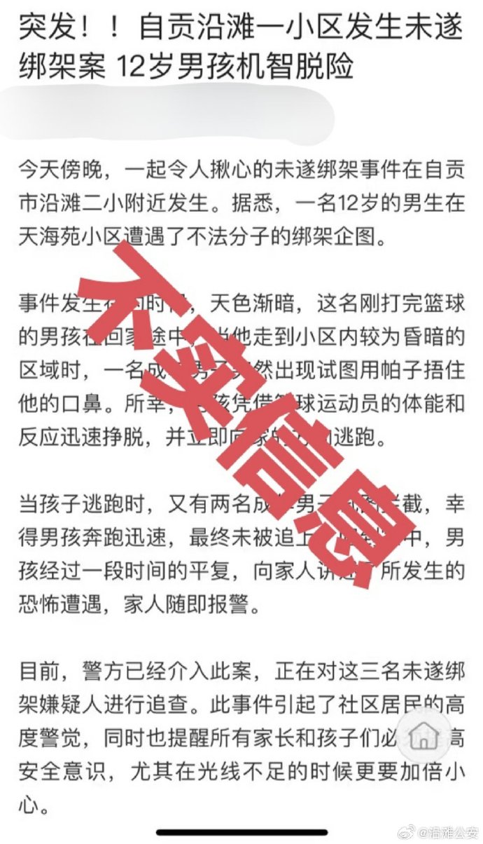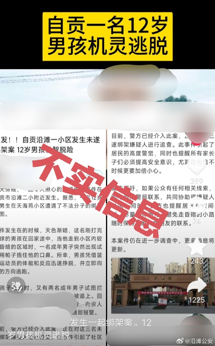 近日,网上流传的“男孩在沿滩某小区遭遇绑架机智脱险”的文章和消息截图,经@沿滩公安 实地走访、调取监控录像、与当事人及其监护人核实,确认系不实信息,请广大市民不信谣、不传谣。