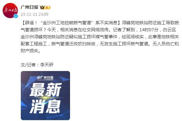 浔峰岗地铁站附近施工导致燃气管道损坏?相关消息在社交网络流传。记者了解到,14时07分,白云区金沙洲浔峰岗地铁站附近疑似施工损坏煤气管事件,经现场核实,此事是地铁相关配套工程施工,燃气管道迁改吹扫排放,无发生施工损坏燃气管道。无人员伤亡和财产损失。