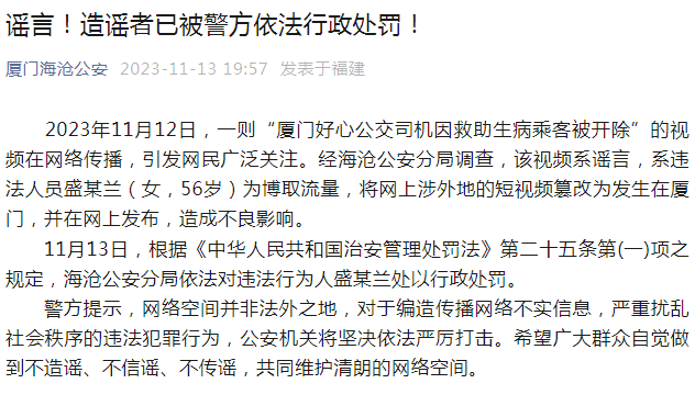 2023年11月12日,一则“厦门好心公交司机因救助生病乘客被开除”的视频在网络传播,引发网民广泛关注。经海沧公安分局调查,该视频系谣言,系违法人员盛某兰(女,56岁)为博取流量,将网上涉外地的短视频篡改为发生在厦门,并在网上发布,造成不良影响。