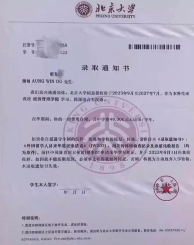 据网传“北京大学录取通知书”截图显示:“缅甸明光忠,我们高兴地通知你,北京大学同意接受你于2023年9月至2027年7月,作为本科生来我校经济管理学院学习,授课语言为汉语……”