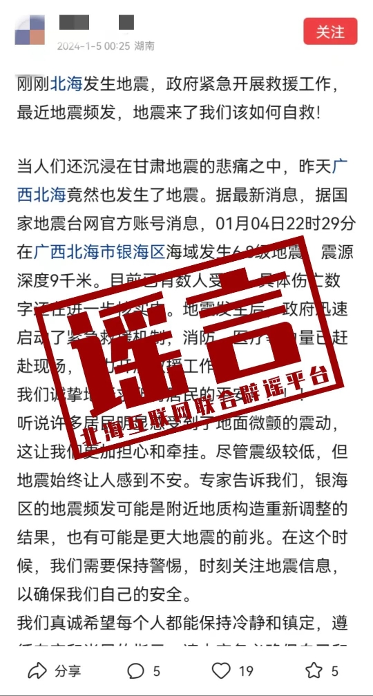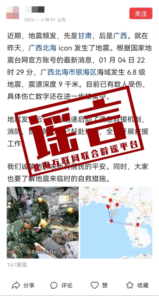网上流传“广西北海市银海区海域发生 6.8 级地震,震源深度 9 千米,目前已有数人受伤”的信息为谣言,请各位网友以官方发布为准。