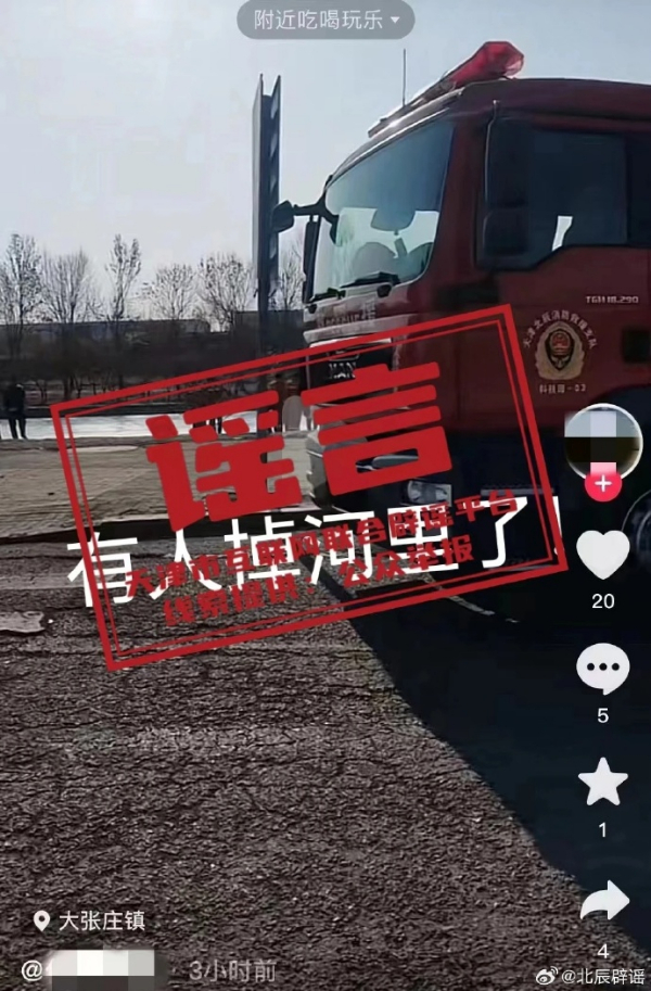 2月7日,“天津市北辰区有人掉河里了”的视频在网络平台传播。经与天津市北辰区公安、消防部门核实,该信息不属实。实际情况为北辰区消防部门开展冰面救援训练,不存在人员落水事故。