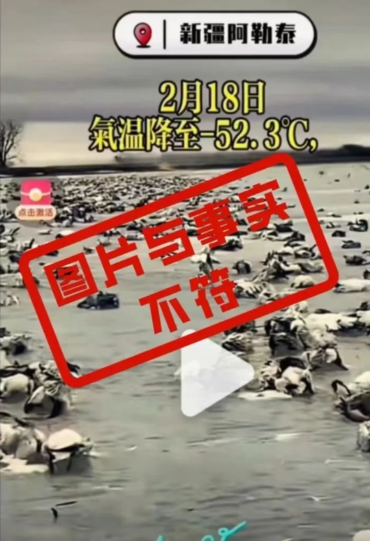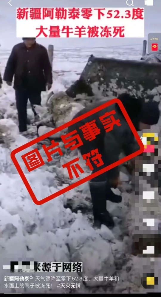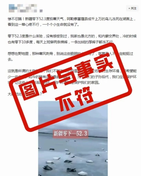 新疆阿勒泰极端天气冻死牲畜和飞禽?官方回应 2024-02-23 15:18 2024年2月18日,新疆阿勒泰地区富蕴县受寒潮影响,辖区普降大雪、气温骤降,最低温度达-52.3℃,突破历史极值。面对寒潮来袭,富蕴县各部门(单位)、乡(镇)积极做好防范应对工作,全力保障人民群众生产生活。 目前,富蕴县强寒潮天气已减弱,此次天气过程中,未造成人员和牲畜鸟类伤亡。 但部分自媒体账号为博取流量 拼凑网上旧图 发布不实信息 扰乱公众视听