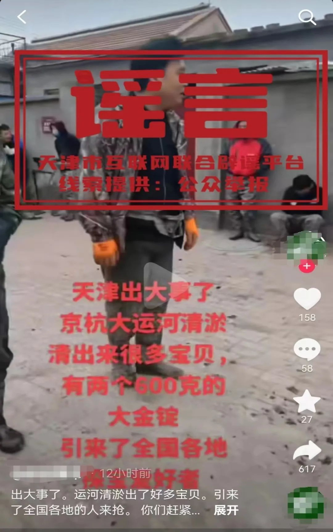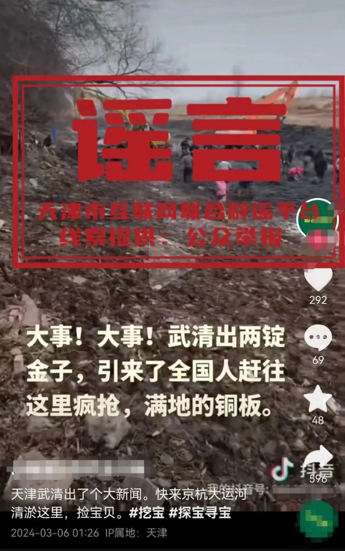 天津武清北运河城区段清淤挖出宝?假的! 2024-03-07 10:58 3月6日,天津市武清区互联网违法和不良信息举报中心接网民举报,抖音短视频平台正在传播“大事!大事!武清挖出两锭金子,引来了全国人赶往这里疯抢,满地的铜板”相关视频信息。经与相关部门核实,不存在挖出金子、古钱币一事,该工程前期已经考古部门考古,未发现文物古迹,请广大群众不信谣,不传谣。
