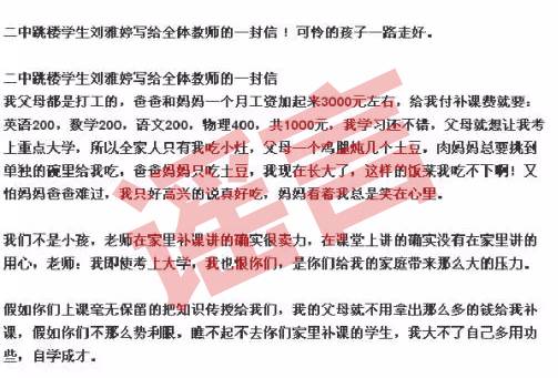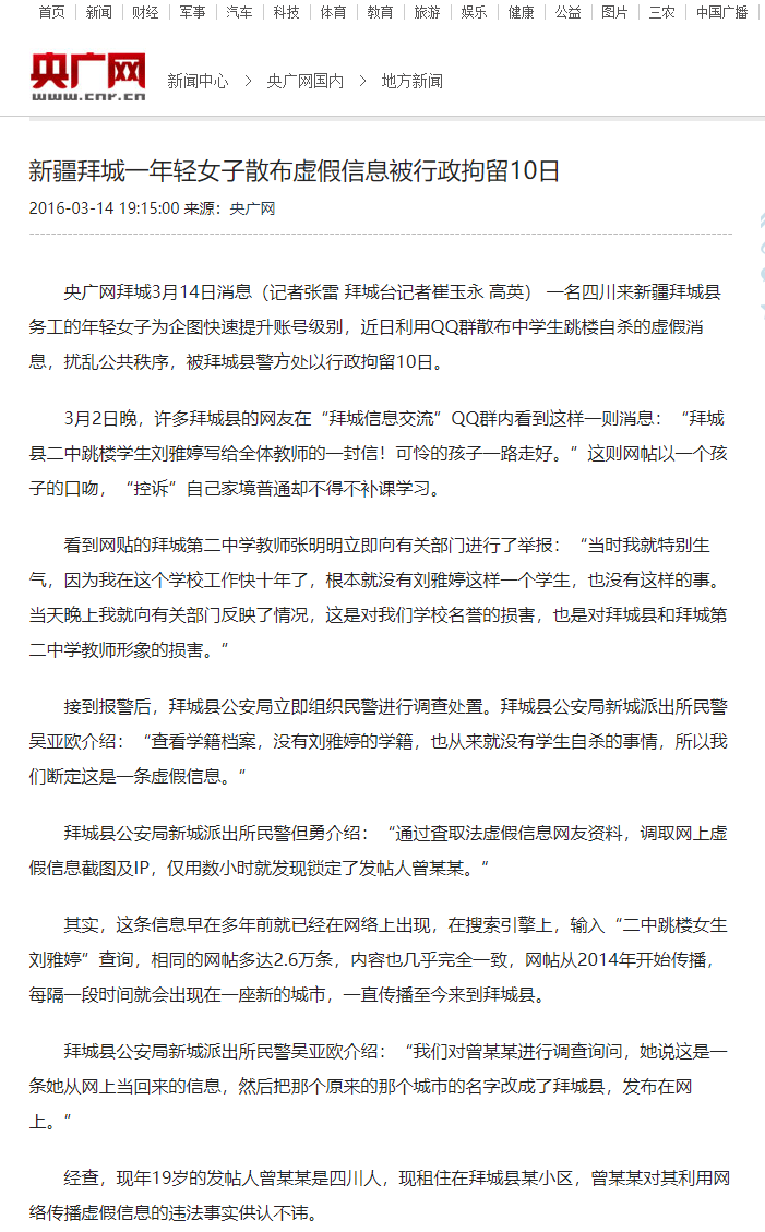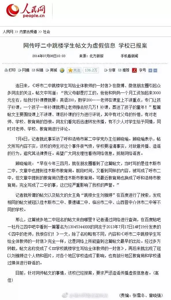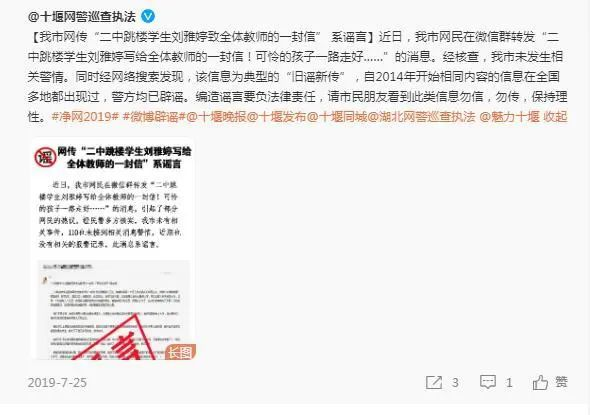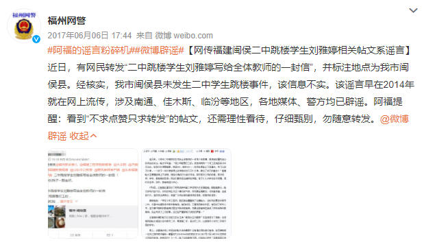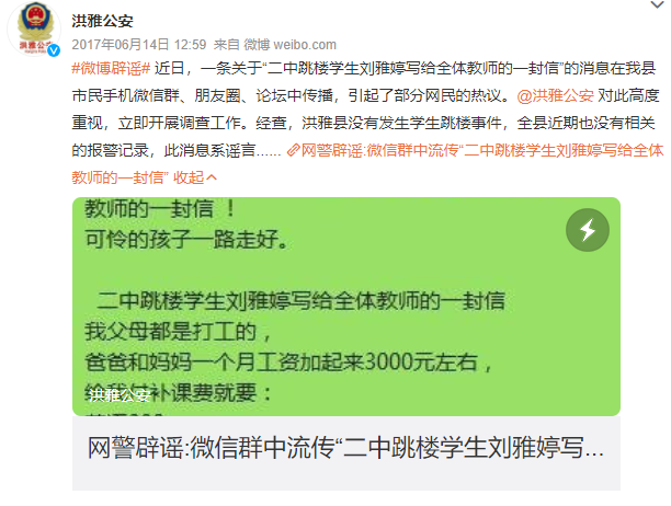 警方深入调查发现,“二中学跳楼学生刘雅婷写给全体教师的一封信”这类谣言多为旧谣新炒。早在2014年,该内容就被冠以各地二中在网上出现,各地也纷纷辟谣。