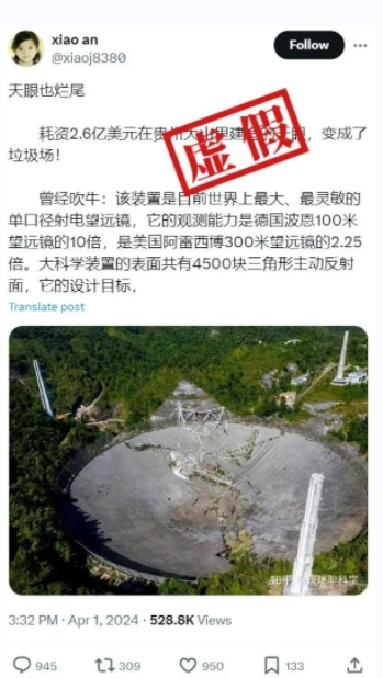综上所述,网传说法为谣传,网传图片实为美国波多黎各的阿雷西博天文台(Arecibo Observatory),该天文台于2020年发生严重坍塌事故,美国国家科学基金会表示不会重建,但会在当地开设教育中心。位于贵州省平塘县的500米口径球面射电望远镜——“中国天眼”(FAST)是目前世界上最大的单口径射电望远镜。FAST官网近日发布了2024年8月至2025年7月观测季的公开征集通知,说明天文台仍正常运作。
