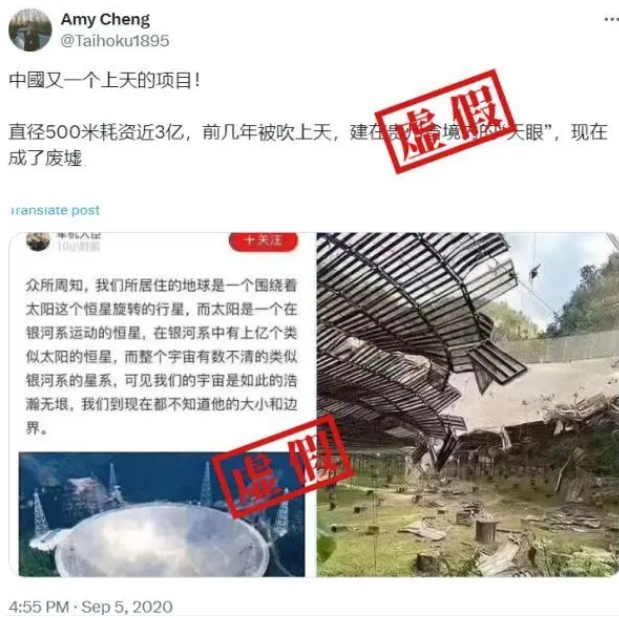 事实上,这并非“中国天眼”第一次“被坍塌”,2020年阿雷西博望远镜第一次出现严重损坏之际,网络中就曾出现过类似谣言。