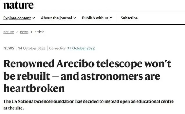 Nature于2022年发布的一篇文章指出,阿雷西博望远镜将不会被重建,美国国家科学基金会已决定在该地点开设一个教育中心。