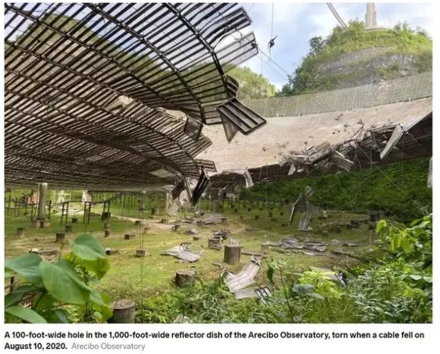 据报道,2020年8月,阿雷西博望远镜的一根辅助电缆断裂,在反射盘上造成100英尺(约30米)的切口,并损坏了悬挂在其上方的接收器平台。11月初,天文台主缆断裂。就此,美国国家科学基金会宣布将停用阿雷西博望远镜,但保持其他设备正常运行。不承想,12月,射电望远镜重约900吨的接收器平台彻底坍塌,从400多英尺(约122米)的高空掉落至下方反射盘。