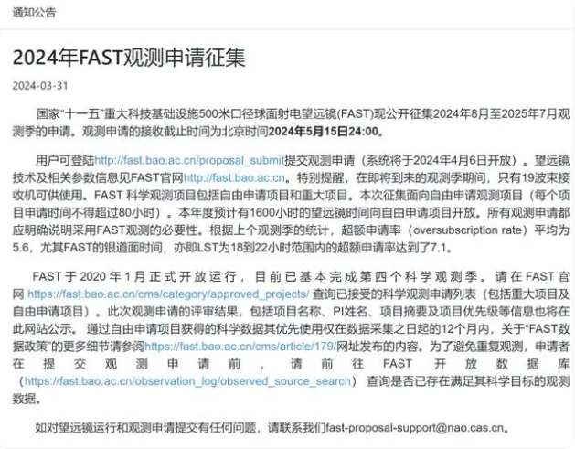 “中国天眼”(FAST)官网于3月31日发布了2024年8月至2025年7月观测季的公开征集通知,申请截止日期为2024年5月15日。“本次征集面向自由申请观测项目(每个项目申请时间不得超过80小时)。本年度预计有1600小时的望远镜时间向自由申请项目开放。”这说明FAST仍处于正常运作中。