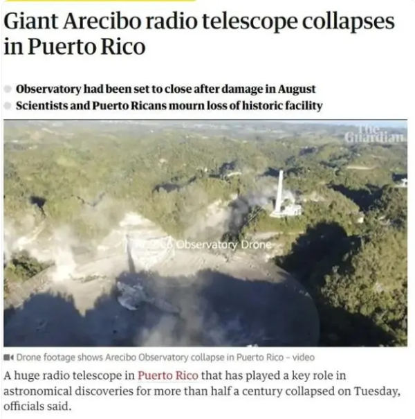 英国《卫报》2020年12月的报道,视频记录了阿雷西博天文台坍塌的过程。
