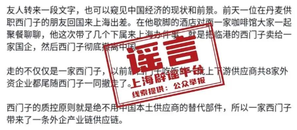 上海辟谣平台辟谣“知名外企彻底撤离中国”后,一批传谣自媒体被处置 2024-04-07 11:06 日前,上海辟谣平台针对“临港的西门子将卖给一家国企,西门子将彻底撤离中国”的谣言进行了澄清。记者4月3日从上海市网信办获悉,一批散播该谣言的自媒体已被处置。 据了解,该谣言是个别自媒体为了造热点、蹭流量而胡编乱造的结果,恶意误导公众,损害了企业声誉,造成不良社会影响。